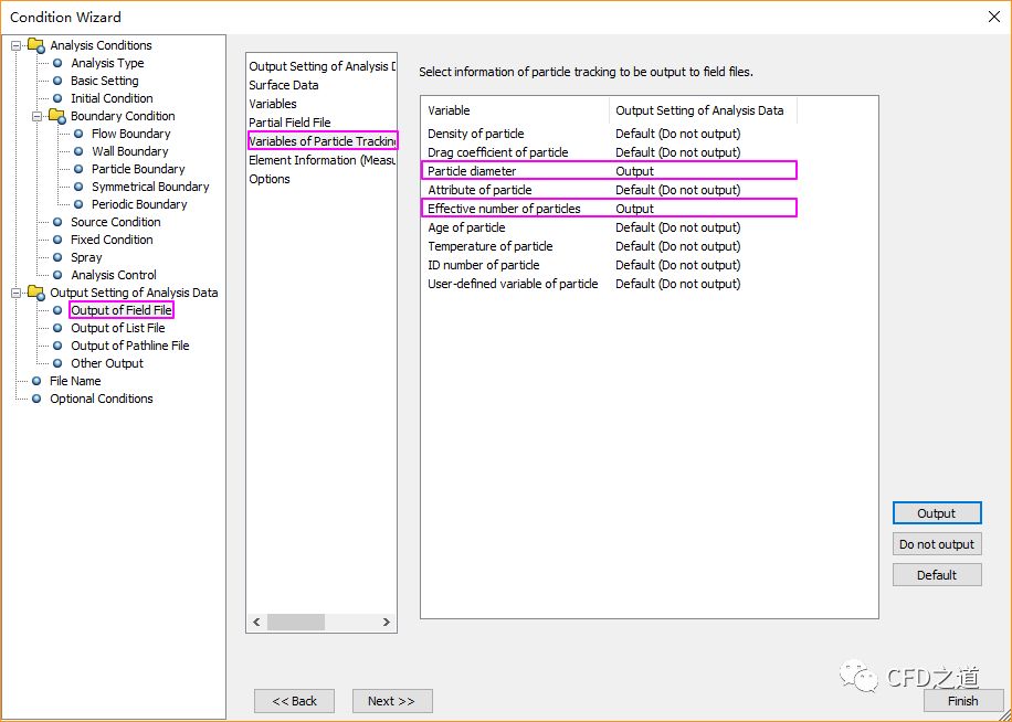 选择选项Variables of Particle Tracking,设置Particle diameter、Attribute of particle为Output