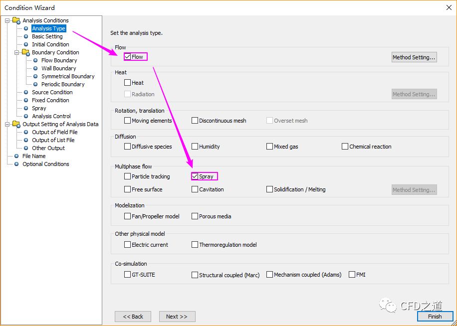 点击模型树节点Conditions,弹出如下图所示对话框,激活模型Flow及Spary