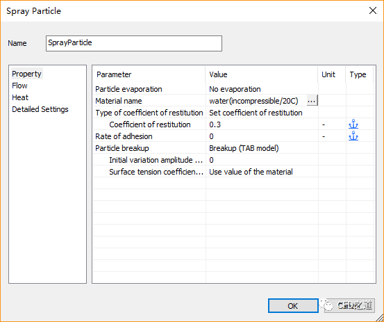 弹出对话框中,如下图所示设置颗粒材料为水,设置颗粒恢复系数及破碎模型