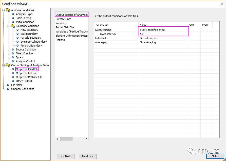 进入Output of Field File节点,选中Output Setting of Analysis Data选项, 设置Output timing为Every specified cycle,并设置Cycle interval为50