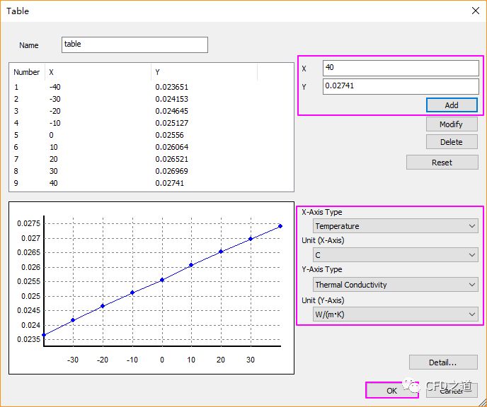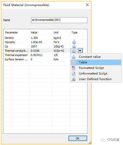 如下图所示,定义在不同温度条件下的导热率,点击OK按钮关闭对话框