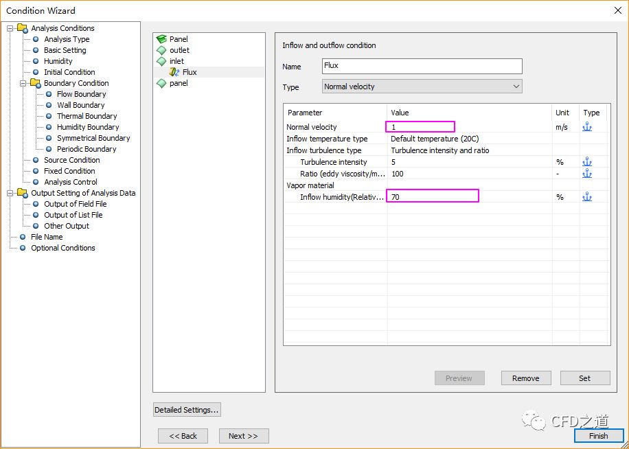 点击节点Flow Boundary,如下图所示,设置边界inlet的速度为1 m/s,相对湿度为70 %,点击Set按钮设置边界