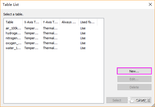 如下图所示的对话框中设置参数Thermal conductivity的Type为Table,弹出设置对话框