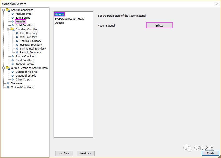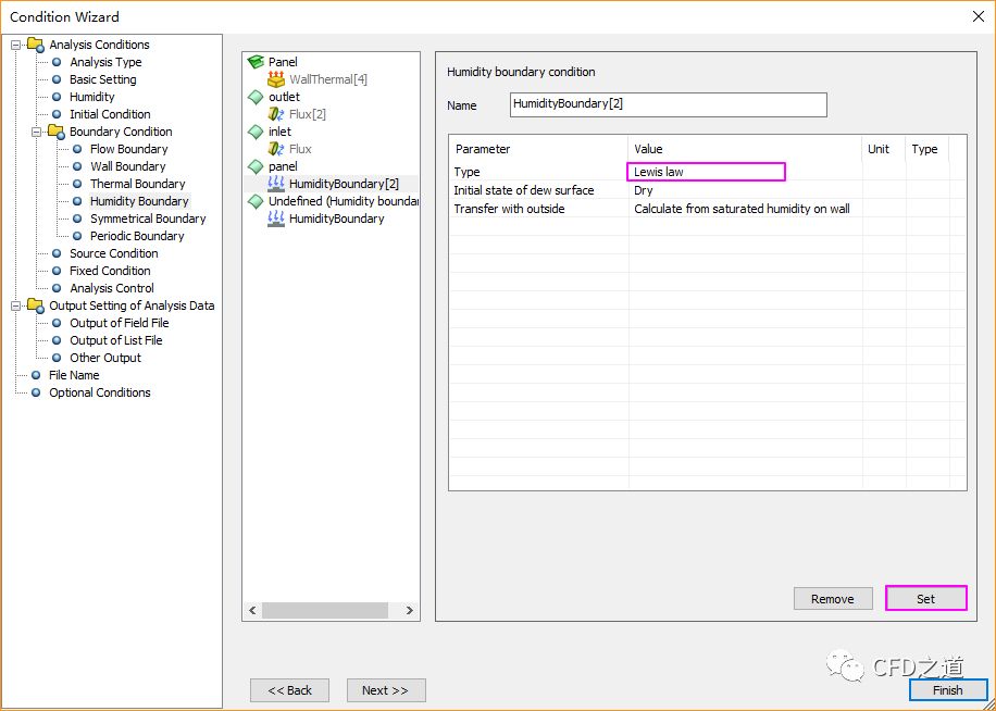 进入节点Humidity Boundary节点,设置panel的Type为Lewis law,点击Set按钮设置边界