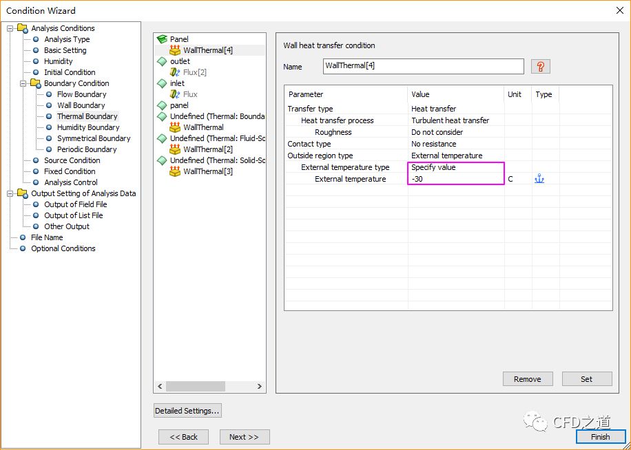 选择列表项Panel,如下图所示,设置External temperature为-30 C,点击Set按钮设置边界