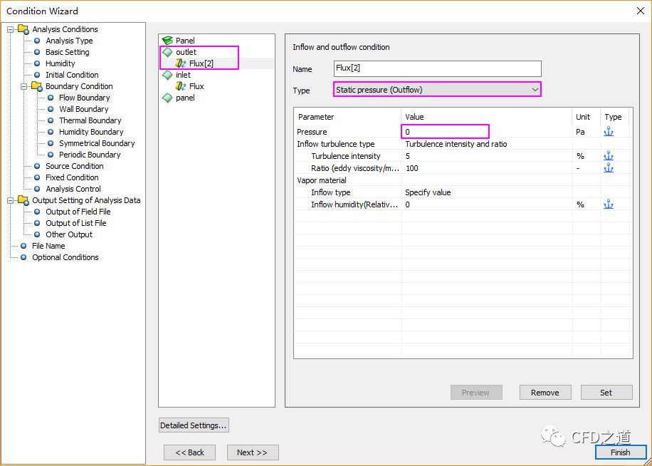 如下图所示,设置边界outlet的边界类型为Static pressure(Outflow),设置压力为0 Pa,点击Set按钮设置边界