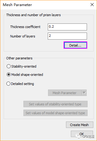 点击Mesh Parameter节点弹出网格参数指定对话框,如下图所示,点击按钮Detail…弹出细节设置对话框