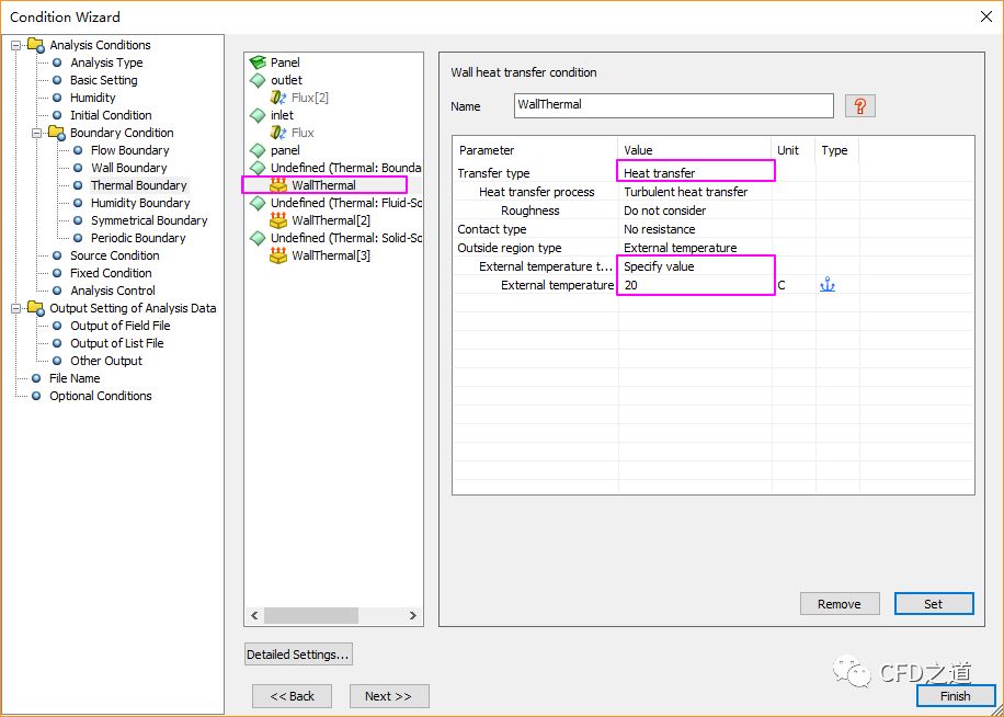 点击节点Thermal Boundary,右侧选择列表项Undefined (Thermal: Boundary with outside),设置Transfer type为Heat Transfer,指定External temperature为20 C,点击Set按钮设置边界