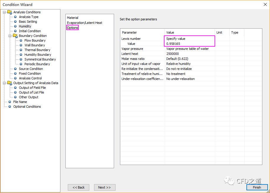 点击Options列表项,右侧设置Lewis number为0.958165
