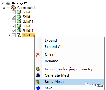 选择节点Blocking,点击鼠标右键,选择弹出菜单项Body Mesh生成体网格