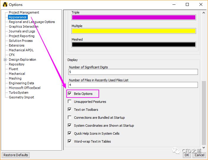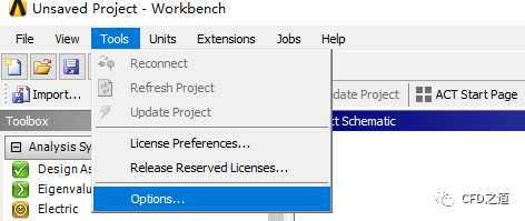 启动ANSYS Workbench,选择菜单Tools → Options…打开选项设置窗口