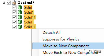选择模型树中所有几何,点击鼠标右键,选择弹出菜单项Move to New Component