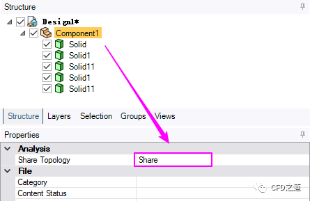 选择节点Component1,设置属性窗口选项Share Topology为Share