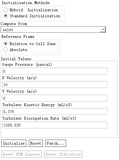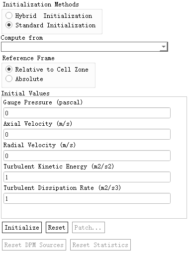 Fluent会根据用户选择的模型动态调整所需要的初始化值。用户可以通过选择该面板中下拉框Compute from来辅助填写初始值。