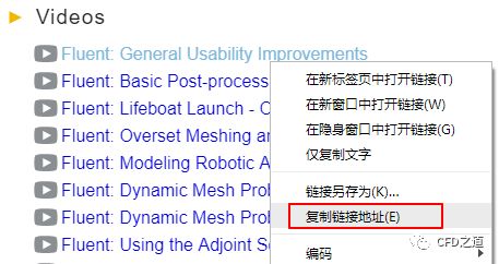 如下图所示为点击列表项Fluent后显示的文档内容。用户可以选择各种在线文档查看,也可以下载Tutorials文档以及案例文件。不过要想查看视频教程则比较麻烦。这些视频都被放在了油管上,没有梯子是看不了的。
