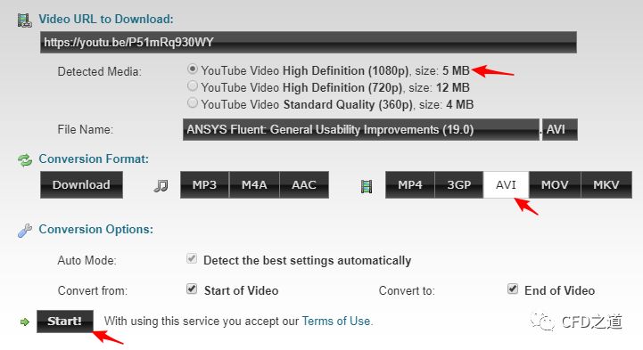 如下图所示,可以选择视频分辨率及视频格式,点击按钮Start!开始转化视频
