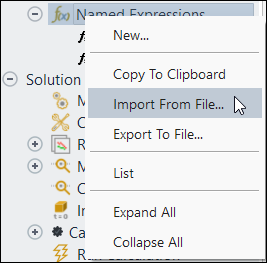 命名的表达式可以被保存,也可导入已经保存好的表达式文件。如下图所示,右键选择模型树节点Named Expressions,弹出菜单项中可以选择Export to File保存表达式,也可以选择Import From File…导入已有的表达式。