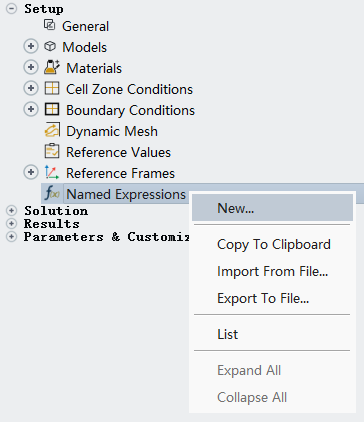 右键选择模型树节点Setup > Named Expressions,点击弹出菜单项New…弹出表达式创建对话框