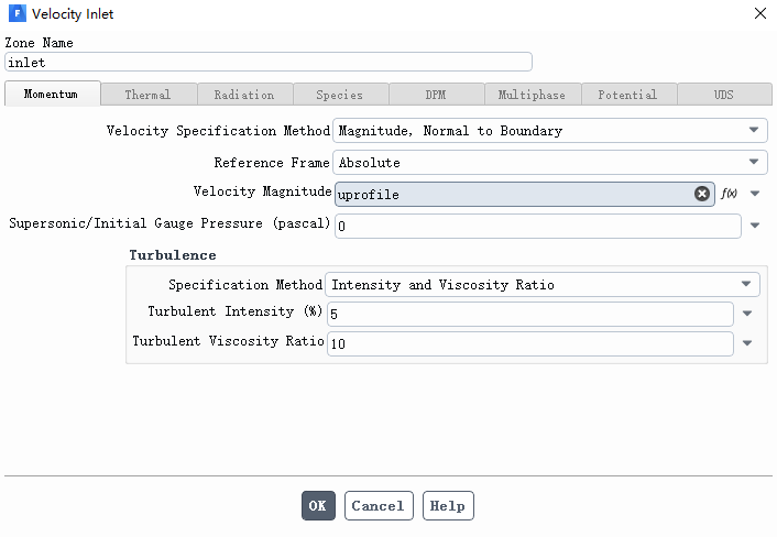 定义入口速度,如下图所示,设置Velocity Magnitude为表达式,输入uprofile