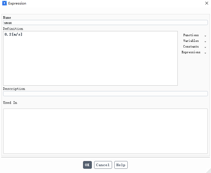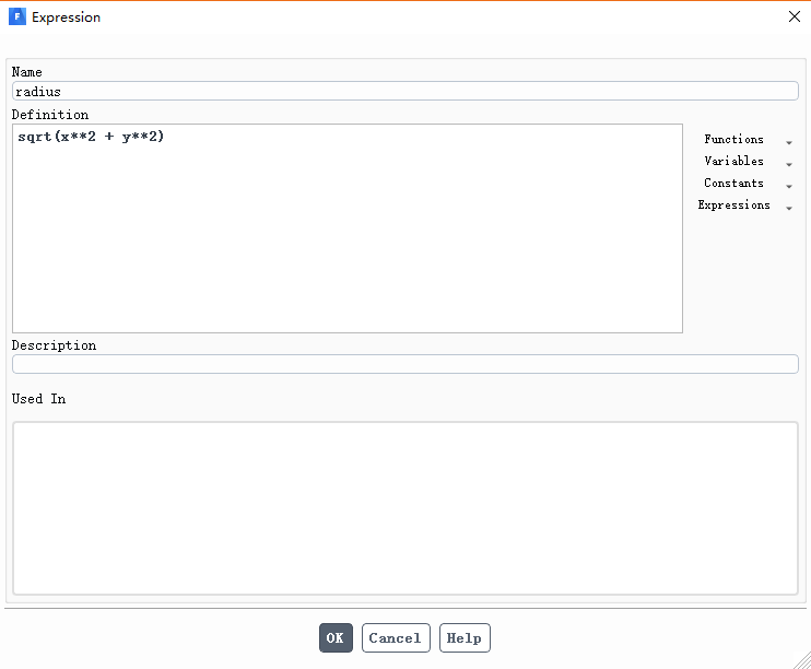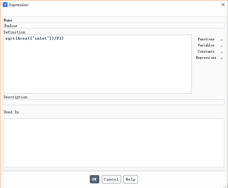 Radius=sqrt(Area([“inlet”])/PI),这里其实也可将其定义为常数,因为半径是已知的。