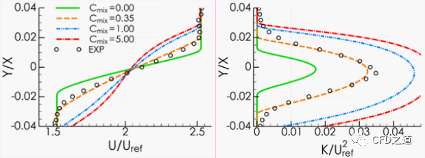 下图显示了Cmix的变化对自由混合层(Csep=2.0)计算的影响。Cmix的增加导致湍流水平的增加和更大的传播速度。