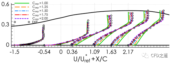 在大多数情况下,用户只需要调整Csep来改变GEKO模型对边界层分离的敏感度。下图显示了该参数对扩散器流的影响。当Csep=1时,模型计算结果与k-e模型基本相同(没有分离),当Csep=1.75时,与数据的一致性接近完美(与SST模型相似)。计算中需要更大的Csep值(例如,在模拟高升力翼型时,即使是SST模型也往往低估分离强度)。