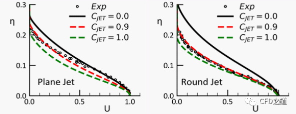 下图为Cjet对平面和圆形射流的影响(Csep=2, Cmix=0.35, Cnw=0.5)。增加Cjet(Cmix是激活的)可以在不改变混合层扩散速率的情况下降低射流的扩散速率。Cjet是Cmix的子模型,因此在Cmix减少的情况下Cjet失效。