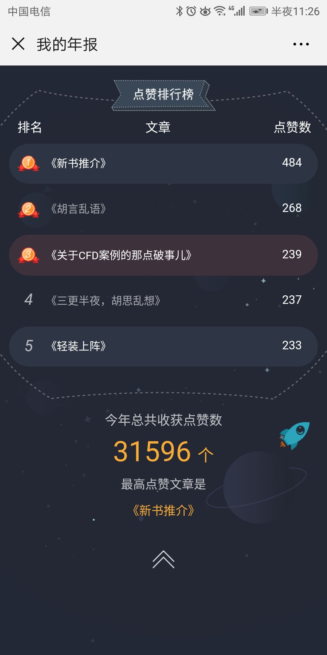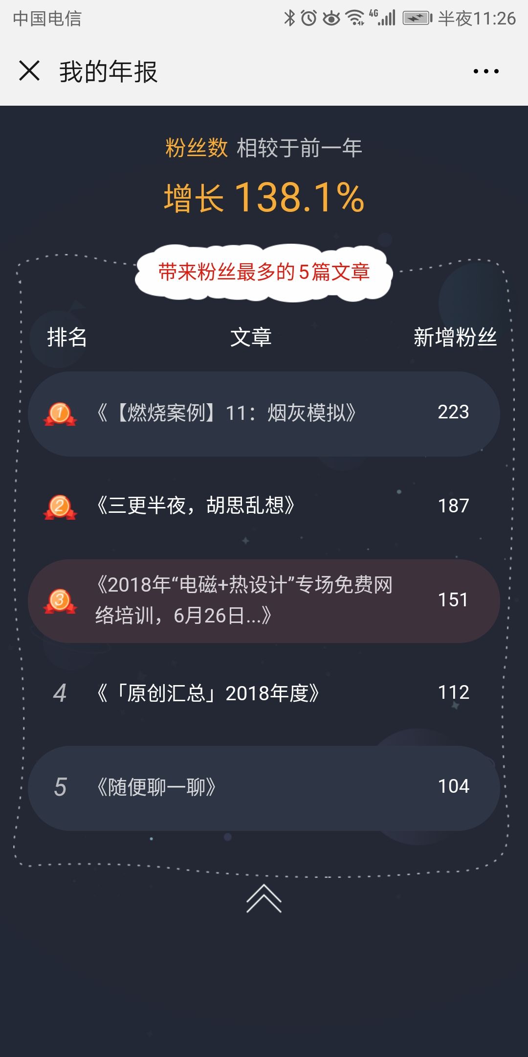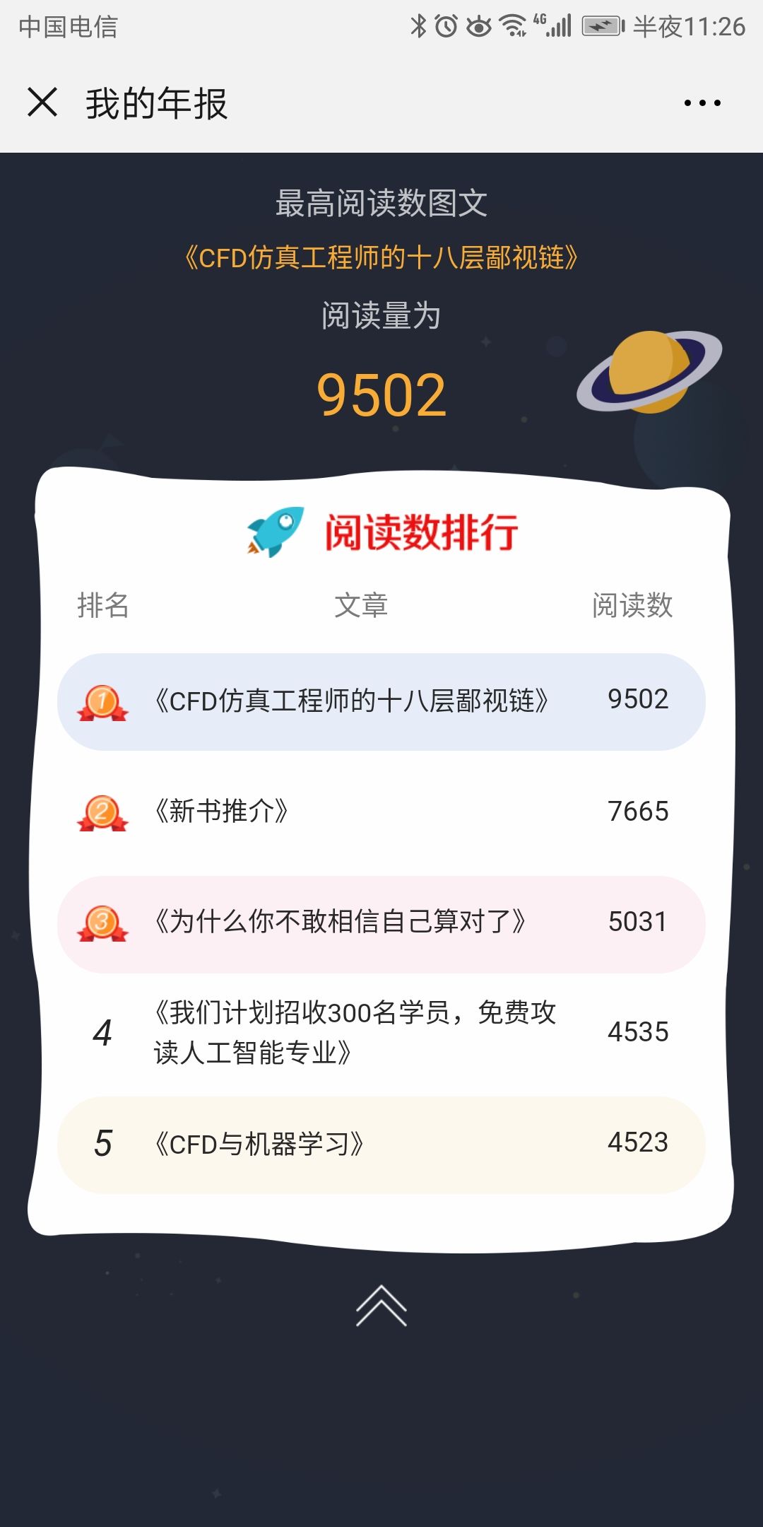 最扎心的是上面这张图。阅读排行榜前五的文章中只有两篇是我的,5篇文章中居然还有一篇是广告。看来标题党的作用不容小觑。排行榜第一的居然是一篇转载的水文(绝不是贬低,这篇文章没有任何的实际意义,纯属搞笑文),看来公众号的主要作用还是用于娱乐。随便瞎扯一篇机器学习都能排上榜,看来CFD真的是没太大前途了。那么多自认干货的文章居然无一上榜,真真的心在滴血!
