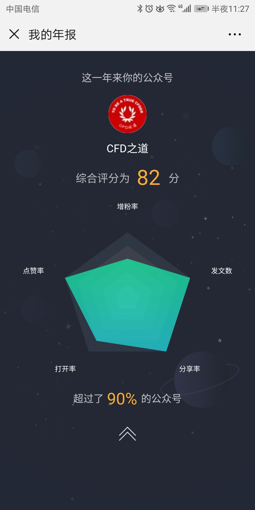 综合评分不知道是个什么鬼,没有比较看不出来什么意思。不过下面一句超过90%的公众号还是略暖人心。看图中的增粉数应该是低于平均水平,不过这也正常,毕竟CFD是个小圈子。