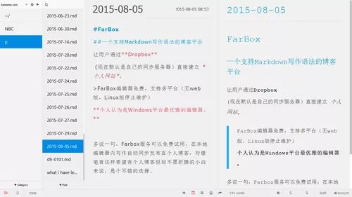 一个支持Markdown写作语法的博客平台,让用户通过Dropbox(现在默认是自己的同步服务器)直接建立个人网站。FarBox编辑器免费,支持多平台(无web版,Linux版停止维护),个人认为是Windows平台最优雅的编辑器。多说一句,Farbox服务可以免费试用,在本地编辑器内写作自动同步发布在个人博客,对像笔者这样希望有个人博客但却不愿折腾的小白来说,是个不错的选择。