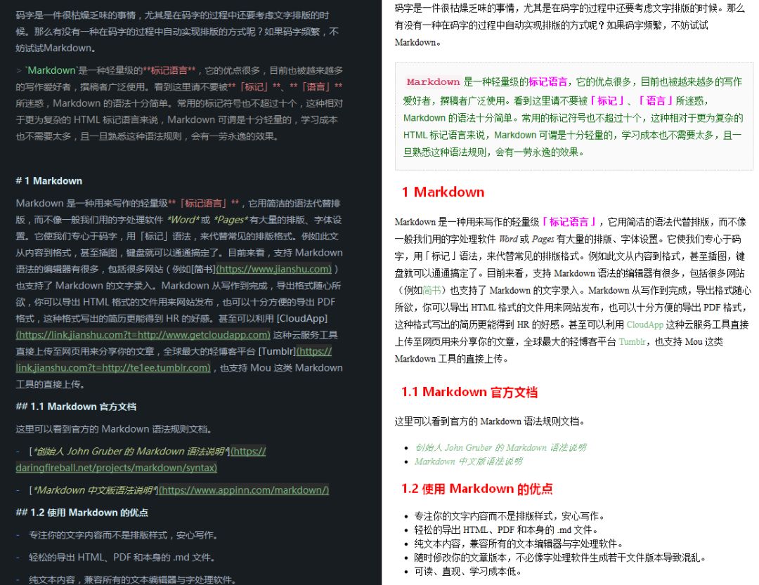 到这里,Markdown 的基本语法在日常的使用中基本就没什么大问题了,只要多加练习,配合好用的工具,写起东西来肯定会行云流水。下图为本文开头部分的Markdown文本及预览
