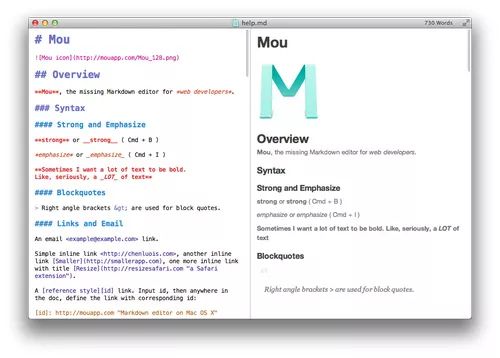 Markdown 是一种用来写作的轻量级「标记语言」,它用简洁的语法代替排版,而不像一般我们用的字处理软件 Word 或 Pages 有大量的排版、字体设置。它使我们专心于码字,用「标记」语法,来代替常见的排版格式。例如此文从内容到格式,甚至插图,键盘就可以通通搞定了。目前来看,支持 Markdown 语法的编辑器有很多,包括很多网站(例如简书)也支持了 Markdown 的文字录入。Markdown 从写作到完成,导出格式随心所欲,你可以导出 HTML 格式的文件用来网站发布,也可以十分方便的导出 PDF 格式,这种格式写出的简历更能得到 HR 的好感。甚至可以利用 CloudApp 这种云服务工具直接上传至网页用来分享你的文章,全球最大的轻博客平台 Tumblr,也支持 Mou 这类 Markdown 工具的直接上传。