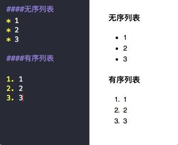 熟悉 HTML 的同学肯定知道有序列表与无序列表的区别,在 Markdown 下,列表的显示只需要在文字前加上 - 或 * 即可变为无序列表,有序列表则直接在文字前加1.2.3. 符号要和文字之间加上一个字符的空格。