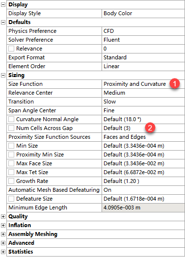 设置Size Function为Proximity and Curvature,并设置下方的Num Cells Across Gap为3,如下图所示。