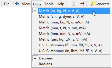 选择子菜单Metric(m,kg,N,s,V,A)*