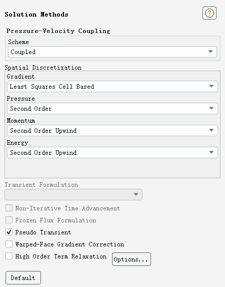 注:这里真的是Fluent自动设置的,我没有做任何修改。不信可以用Fluent 2019试试。以前的老版本可能会选择Coupled,但并不会勾选Pseudo Transient。