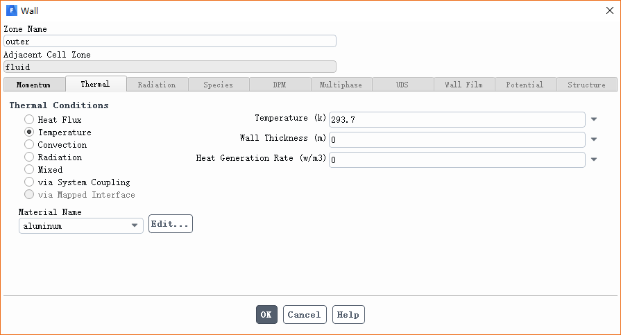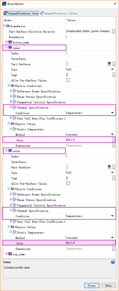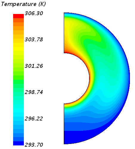 然而边界条件却不同,Fluent中内壁面温度373 K,外壁面温度327K。而STAR中内壁面温度306.3K,外壁面温度293.7K。而Fluent文档中给出了两个对称面上的温度测量数据,STAR中给了个等效导热率。不过从文献来看,这两种验证方式都是可以的。这次以STAR CCM+的条件作为验证条件。