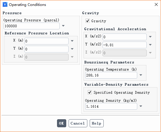 注:这里要求设置参考密度为1.1614及参考压力为100000 Pa