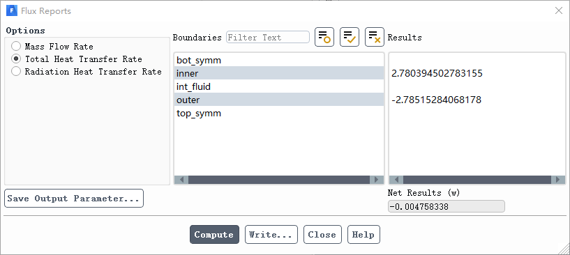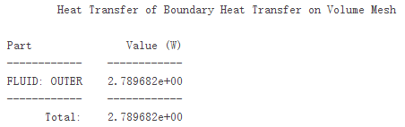 查看报告中外壁面的换热量,如下图所示为2.789682W,本案例计算的是对称几何,因此总换热量keq应为5.58W。