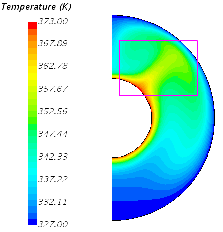 为什么上次的案例出了问题呢,上次计算内壁面温度373K,外壁面温度327K,这个温度数据来自于Fluent验证文档。结果计算下来如下图所示。图中红框位置很明显不符合现实,算30000步还是这个样子。