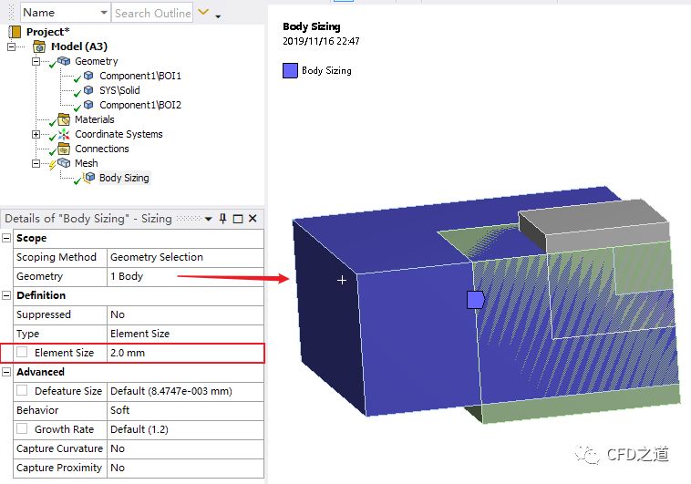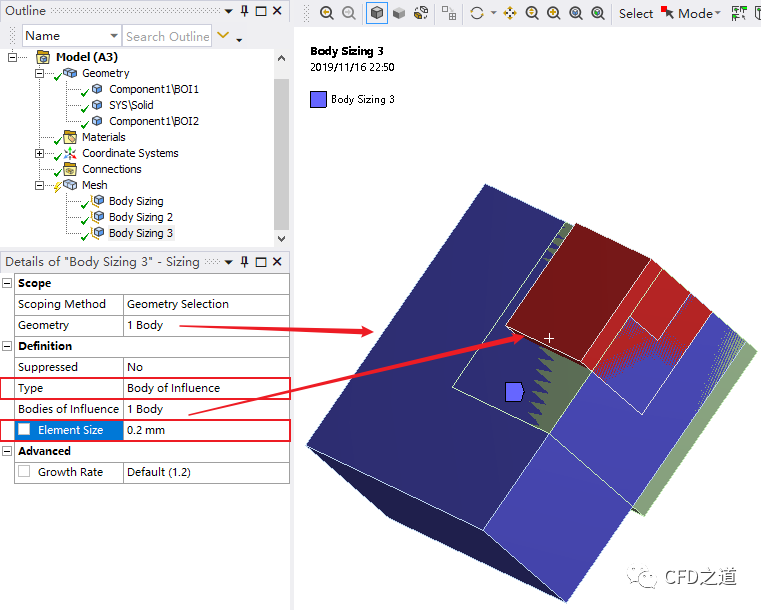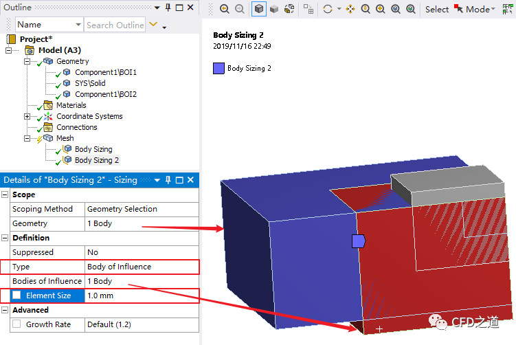 如下图所示,插入Body Sizing,指定类型为Body of Influence,指定外部BOI区域网格尺寸为1 mm