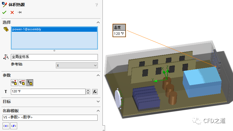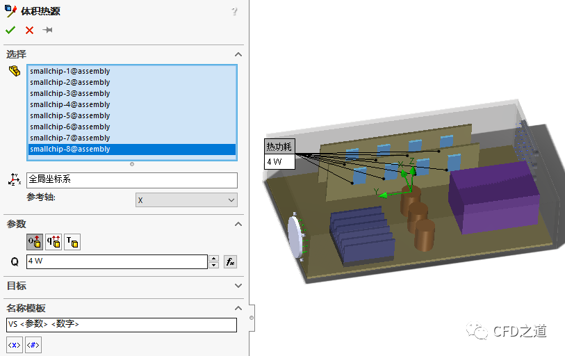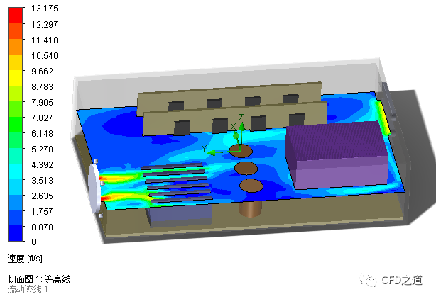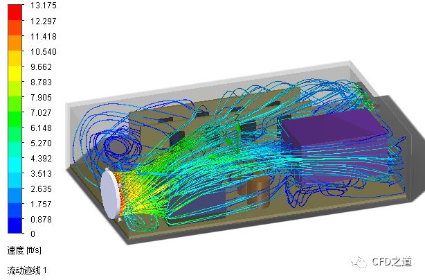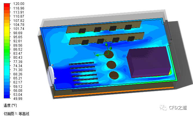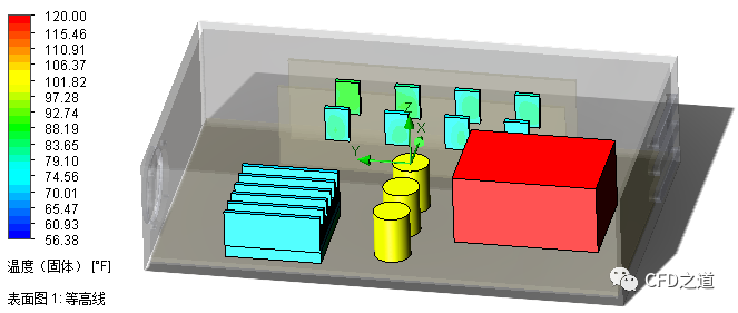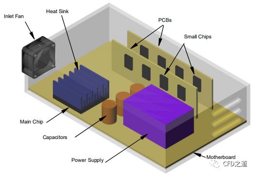 计算模型如下图所示。其中入口采用风扇送风,计算域内部包含多个电子元器件,其作为热源影响计算域内温度分布。
