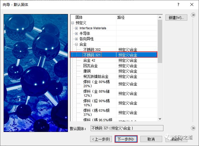 如下图所示,指定默认固体材质为不锈钢321,点击按钮下一步