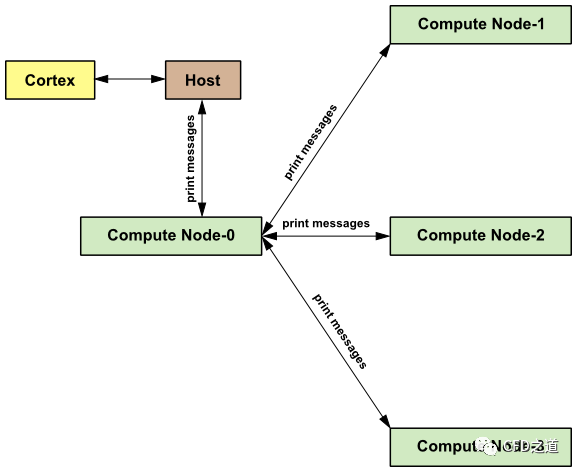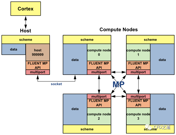 并行计算中包含一个主节点(Host节点),主节点不包含网格单元、面或节点(除非使用DPM共享内存模型),它的主要目的是解释来自于Cortex(负责用户界面和图形相关功能的ANSYS Fluent过程)的命令,然后将这些命令(和数据)传递给一个计算节点(称之为node0),该计算节点将这些命令(和数据)分发给其他计算节点(node1、node2…),整个流程如下图所示。Host节点相当于包工头,node0节点相当于小队长,其不仅要传递命令,还同时执行计算,至于往下的各计算节点,那就纯粹是临时工了,别管那么多,干活儿就对了。