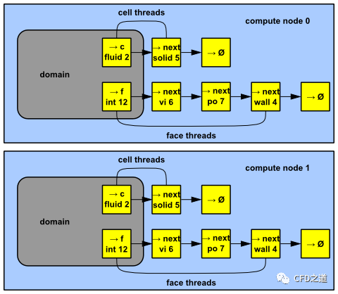 计算节点在其网格上存储数据并执行计算,而沿着分区边界的单层重叠网格单元提供了跨分区边界的数据通信和连续性。即使对网格单元和网格面进行了分区,网格中的所有Domain和thread也都镜像到每个计算节点上。Thread与串行解算程序中一样以链表的形式存储。计算节点可以在使用相同或不同操作系统的大规模并行计算机、多CPU工作站或工作站网络上实现。
