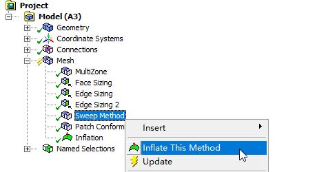 鼠标右键选择模型树节点Mesh > Sweep Method,选择菜单Inflate This Method
