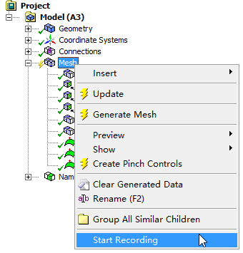 右键选择模型树节点Mesh,选择菜单Start Recording