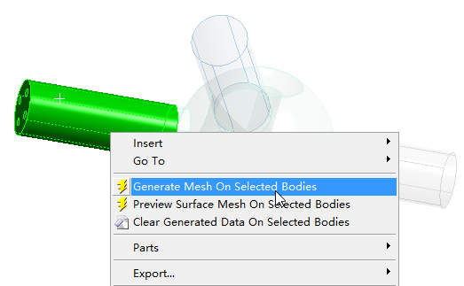 选择三个Sweep部件,点击鼠标右键,选择菜单Generate Mesh On Selected Bodies