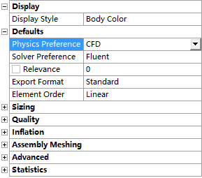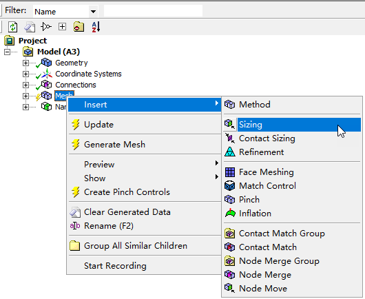 鼠标右键选择模型树节点Mesh,选择菜单Insert → Sizing