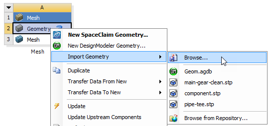 鼠标右键点击Geometry单元格,选择菜单Import → Browse…,在弹出的文件选择对话框中打开文件Geom.agdb